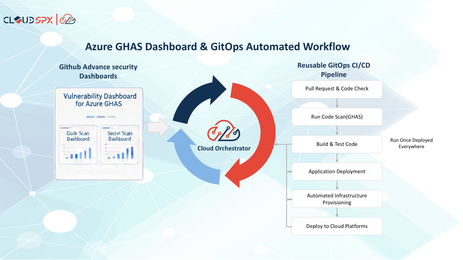 The transition from "Code" to "Stage" is governed by a strict, automated GitOps workflow managed by CloudSPX and Kaktox.